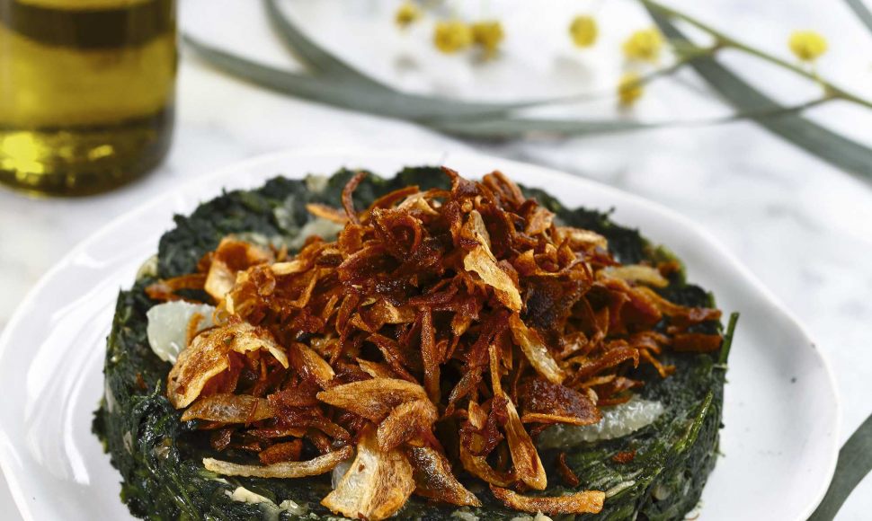 Hındbé : poêlée d’épinards, oignons croustillants et citron vert