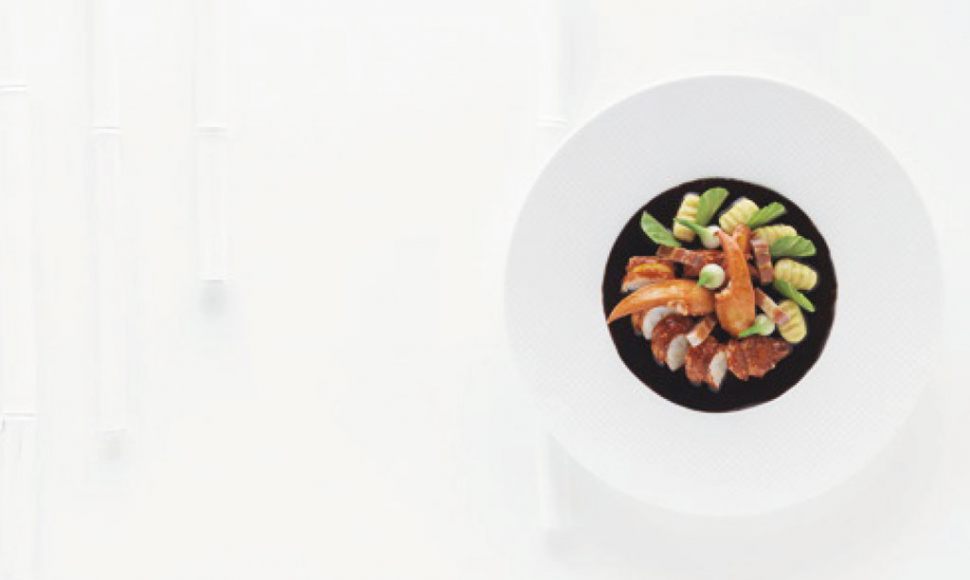 Homard bleu à la broche, lardons/petits oignons et gnocchi de potiron, sauce civet
