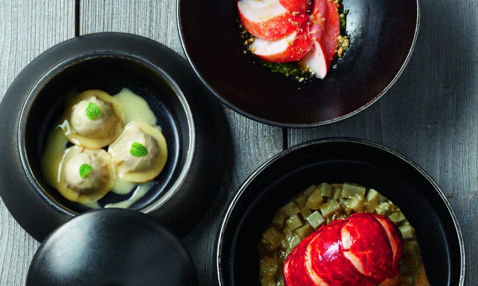 Homard bleu confit au beurre de noisette, pince en barigoule et coudes en ravioles
