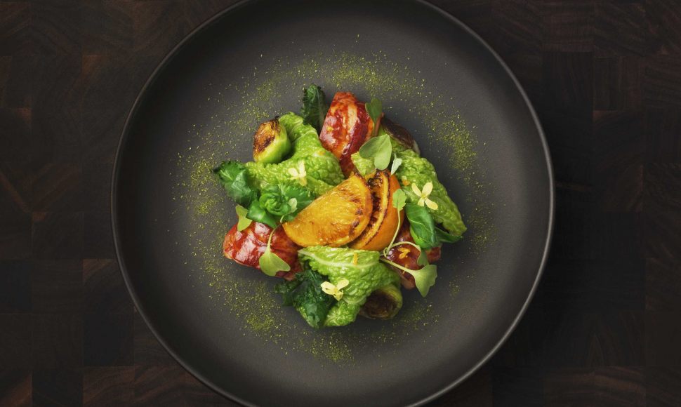 À travers ce plat le chou est parfaitement mis en avant, il est fumé et s'accompagne d'un homard en sauce civet, au vin rouge et de quartiers de clémentines snackés pour des notes sucrées et acidulées.