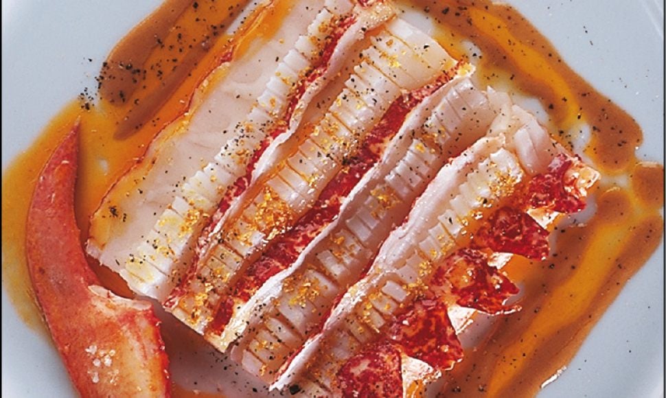 Homard breton à la broche et calmars vivement saisis, sauce d’un bouillon émulsionné au jus de la presse