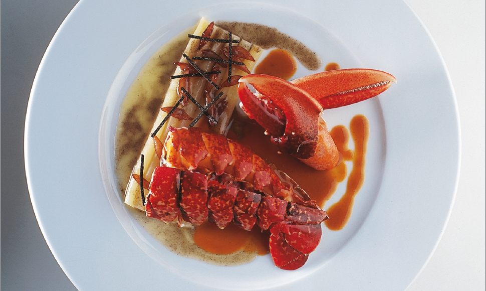 Homard breton à la rôtissoire, salsifis étuvés et caramélisés, jus de la presse