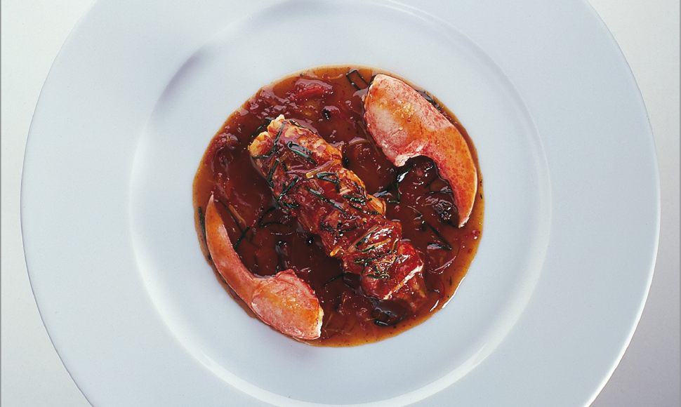 Homard breton cuit au sautoir puis décortiqué, les sucs de cuisson tomatés, aux parfums d’ail et de gingembre