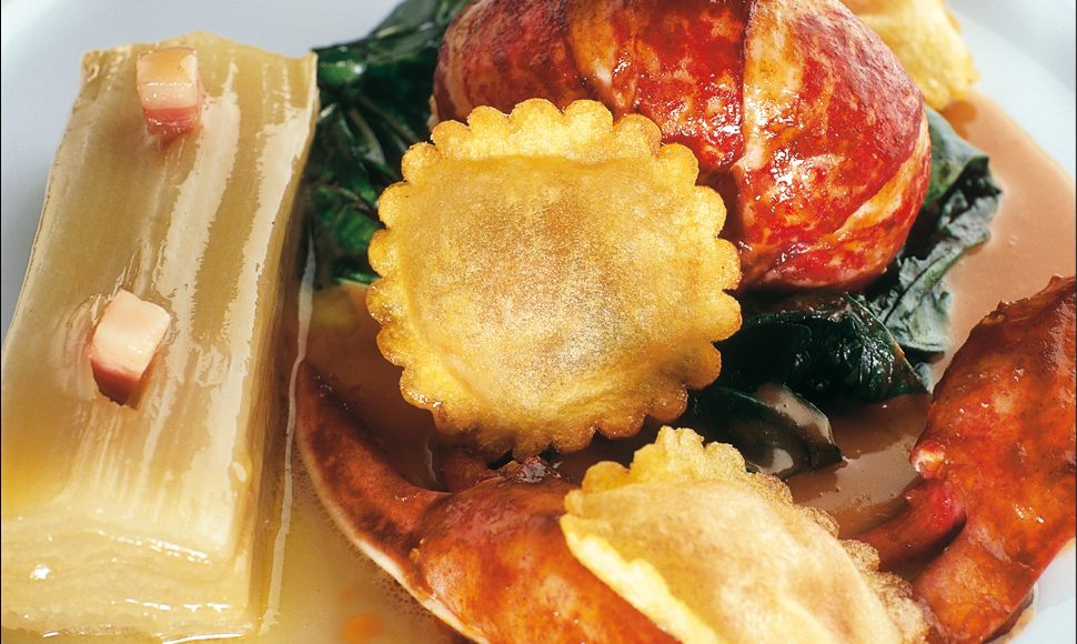 Homard breton de nos viviers, jus de la presse coupé de beurre noisette au vieux vinaigre de collioure, blettes fondantes piquées de lard