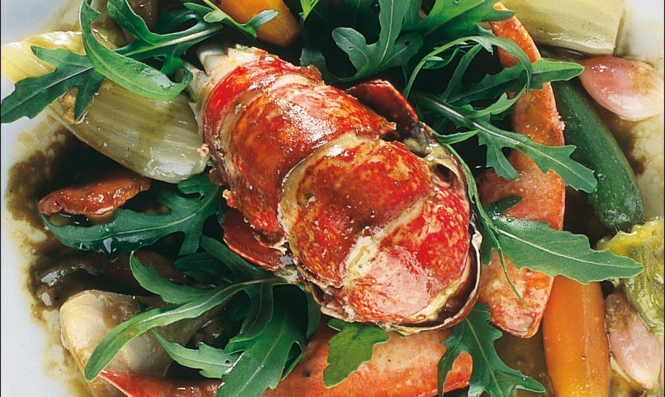 Homard breton de nos viviers sauté à cru, grecque de légumes, jus de la presse