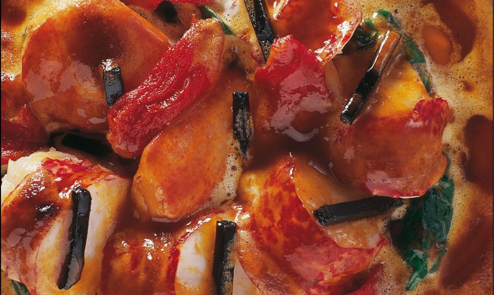 Homard breton légèrement gratiné, jus réduit, tomates et truffes en gros bâtonnets