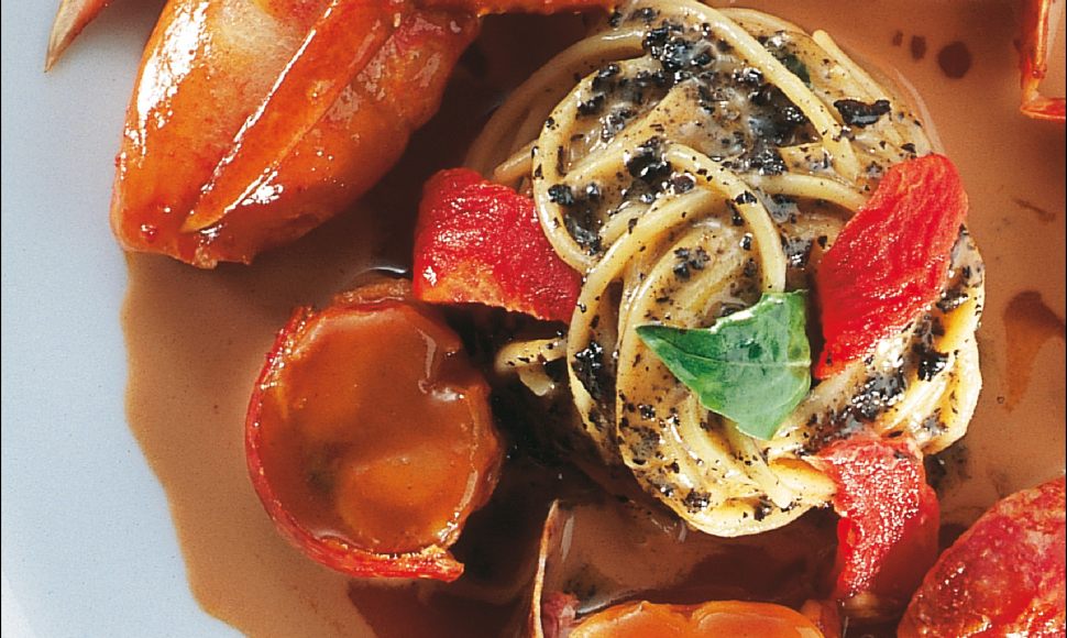 Homard de nos viviers cuit sur la braise, jus de la presse, spaghettini, truffe, tomate, basilic