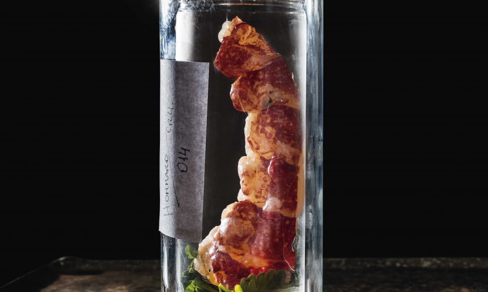 Enlevez la tête des homards. Piquez leurs corps sur une pique en acier et brûlez-les au chalumeau jusqu’à ce que les carcasses deviennent rouges. Lorsque les homards sont froids, décortiquez-les et coupez-les en deux dans la longueur. Conservez les carcasses pour la suite de la recette.