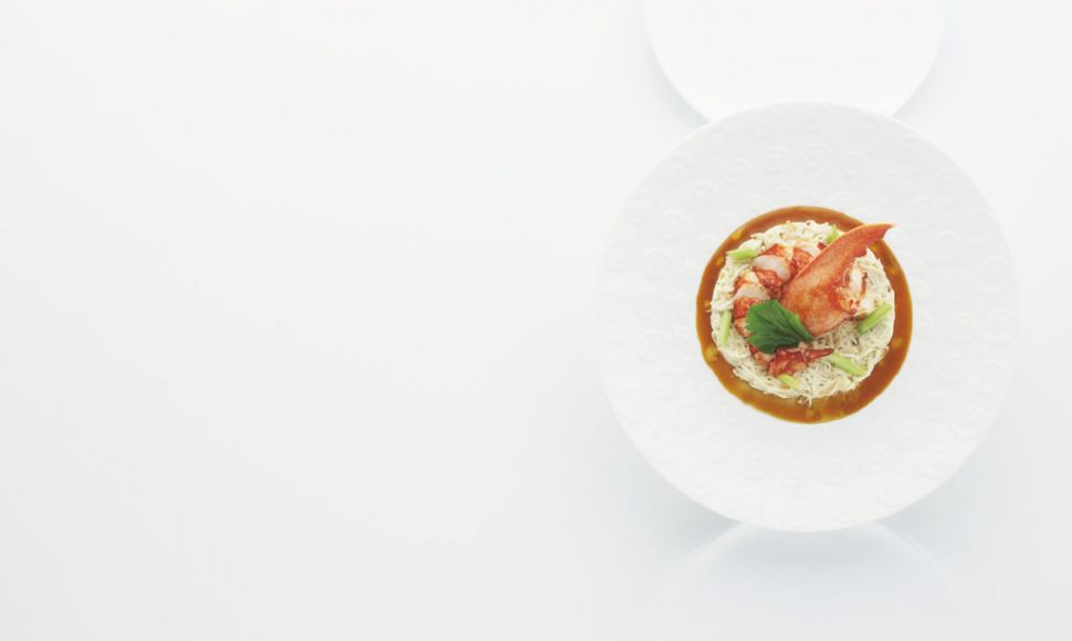 Homard sauvage du Canada cuit au court-bouillon, céleri-rave en rémoulade, sucs des carcasses vinaigrés