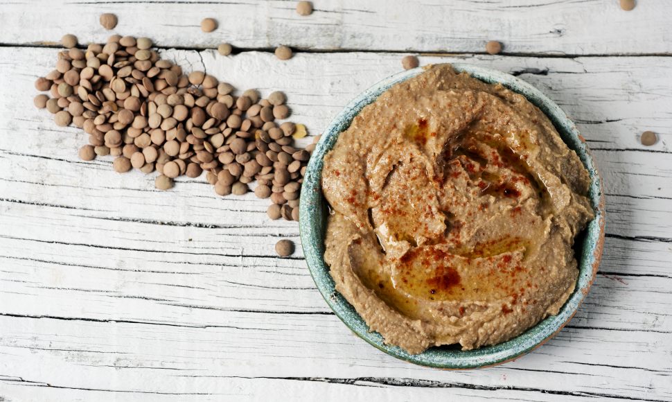Préparez l’houmous. Cuisez les lentilles pendant 30 min dans une casserole d’eau avec la carotte, l’oignon et le laurier. Égouttez-les et assaisonnez-les d’huile d’olive, de vinaigre, de sel et de poivre.