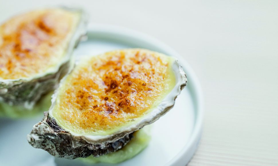 Ouvrez les huîtres, récupérez leur eau et filtrez-la. Retirez les huîtres de leur coquille et conservez-les dans un bol avec leur deuxième eau. Conservez les coquilles. Dans une casserole, faites bouillir la première eau des huîtres avec 10 cl d’eau, puis pochez les huîtres pendant 10 s. Retirez-les et égouttez-les sur un linge.