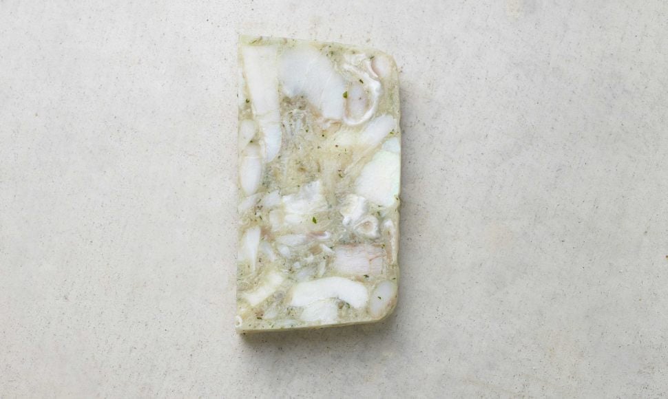 Mettez les arêtes à cuire dans le rondeau, mouillez de bouillon d’épluchures de légumes à hauteur. Faites cuire assez lontemps pour extraire le collagène des peaux et cartilages, puis faites réduire à glace. Taillez la chair en tronçons de 2 cm. Hachez les parties gélatineuses et les peaux lisses, et vérifiez qu’il n’y reste pas des morceaux de cartilage.