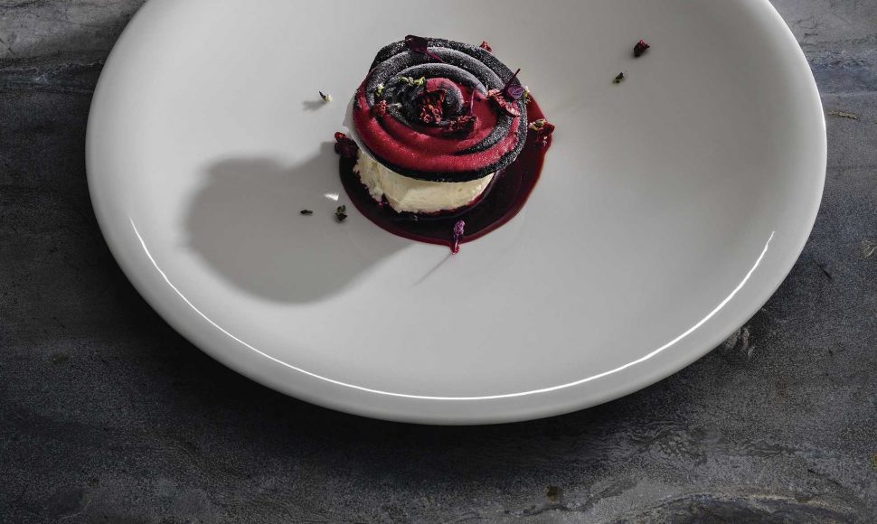 Une pâtisserie hypnotique, harmonieuse et douce. L'alliance des saveurs de vanille fumée, chocolat blanc et framboise donnent une vraie subtilité à ce dessert unique.