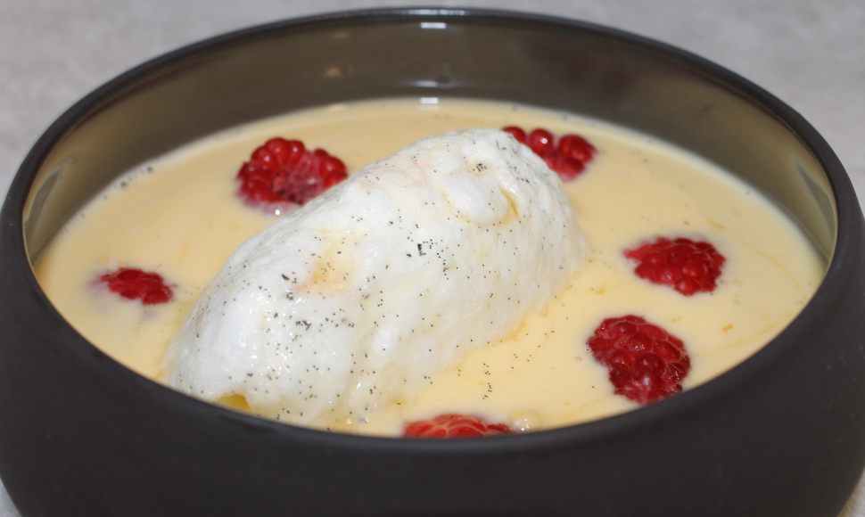 Le secret d'une bonne île flottante réside dans la texture de vos blancs en neige. Si ils manquent de fermeté, le côté aérien tant apprécié de ce dessert perd de sa splendeur. Dans cette recette, quelques framboises fraîches et entières sont ajoutées pour apporter une note fruitée.