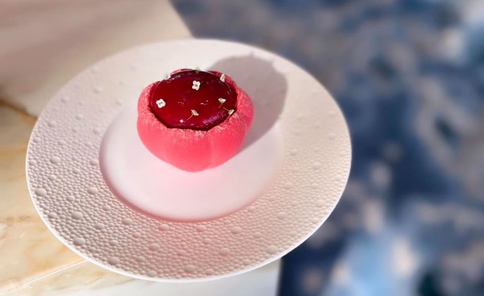 Cette pâtisserie délicate a été élaborée par le chef Christophe Devoille pour l’hôtel Atlantis The Royal à Dubaï qui abrite The Royal Tearoom qu’il abrite.