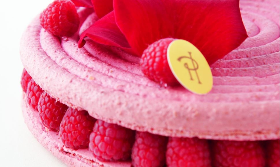 Ce gâteau est une subtile alliance de la crème aux pétales de rose, douce et suave, avec le litchi dont la saveur, prolongement de celle de la rose et de la framboise, contraste avec celles-ci par son acidité et sa puissance, le tout dans une enveloppe moelleuse et craquante de macaron.