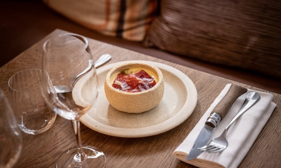 Jambon AOP Jabugo, brouillade d'oeufs, Ossau-Iraty et sauge