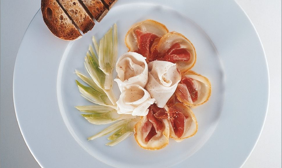 Jambon de jabugo séché trente mois, lard gras de porc de ferme au parfum d’ail et de romarin, fenouil frais, pain de campagne au feu de bois