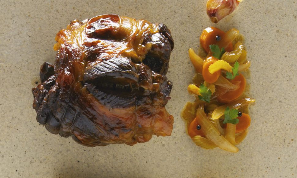 Parer le jarret en laissant apparaître 5 cm d’os, le ficeler et le saler. Chauffer un peu d’huile d’olive dans une cocotte, colorer le jarret de tous côtés. Réserver.