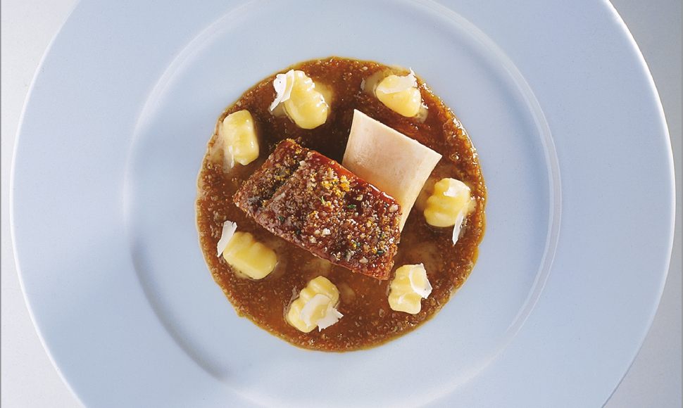 Jarret de veau de lait fermier façon osso-buco, gnocchi de pomme de terre caramélisés aux sucs de viandes