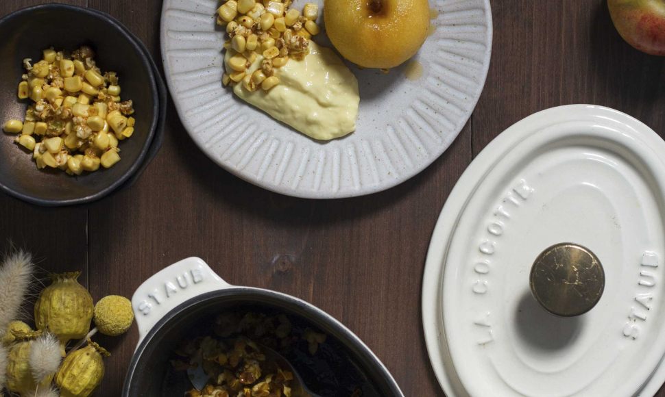 Une pomme rôtie au beurre et au miel, accompagnée d'une crème onctueuse de maïs, de pop-corn caramélisés et d'une salade de maïs.