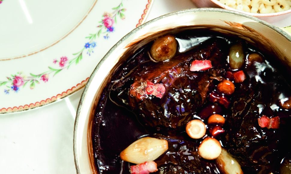 La veille, épluchez et émincez la carotte, l’oignon et le céleri. Placez les joues dans une jatte et recouvrez-les des légumes émincés. Arrosez avec le vin rouge, ajoutez les clous de girofle, le poivre et laissez mariner pendant 24 h. Le jour même, préchauffez le four à 180 °C (th. 6). Égouttez les joues de bœuf et nettoyez-les bien, puis passez la marinade au chinois étamine. Saisissez les joues de bœuf dans une poêle avec l’huile de pépins de raisin. Ajoutez la garniture de la marinade et faites-la suer jusqu’à ce qu’elle soit légèrement colorée. Disposez les joues et la garniture poêlée dans une cocotte, saupoudrez de farine et enfournez pendant 3 min à découvert, arrosez de vin rouge et portez à ébullition. Écumez, puis ajoutez la tomate concassée, l’orange et le bouquet garni. Laissez cuire à feu doux et à couvert quelques instants, puis faites réduire de moitié. Complétez ensuite avec le fond de veau. Couvrez et laissez cuire à feu très doux pendant 3 h 30. Réservez les joues. Passez le jus de cuisson dans une passoire en le pressant bien à l’aide d’une cuillère. Filtrez la sauce dans la cocotte et portez-la à bonne consistance. Une fois celle-ci bien sirupeuse, ajoutez les joues et laissez compoter à feu très doux. Brossez et coupez le pied des champignons, puis taillez la poitrine en lardons. Lavez et épluchez les oignons grelots, puis faites-les revenir dans un sautoir avec 1 c. à s. d’huile d’olive. Une fois bien dorés, ajoutez un peu de sucre et 20 g de beurre, rectifiez l’assaisonnement, puis glacez-les à brun tout doucement pendant 10 min.