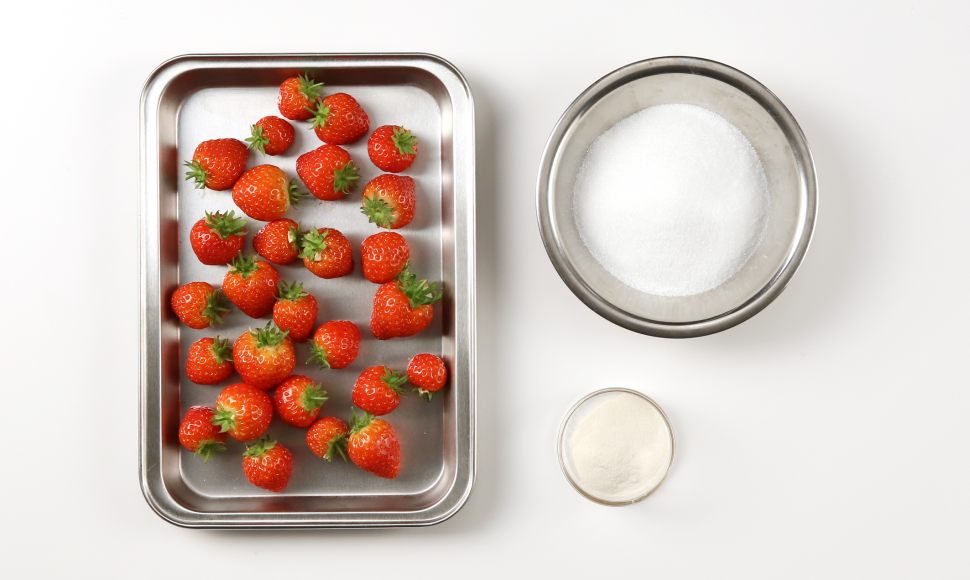 Rincer, équeuter les fraises ou trier les framboises. Mélanger les fruits avec le sucre dans une bassine. Filmer. Chauffer au bain-marie jusqu’à ce qu'ils aient rendu tout leur jus.