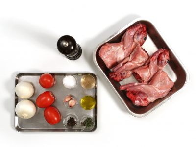 Concasser les avants ou les parures de lapin. Éplucher et couper l’oignon en huit quartiers. Claquer les gousses d'ail. Laver les tomates, les couper.