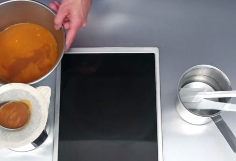 Passer la base de jus recueilli au chinois étamine. La refroidir. La réserver au frais.