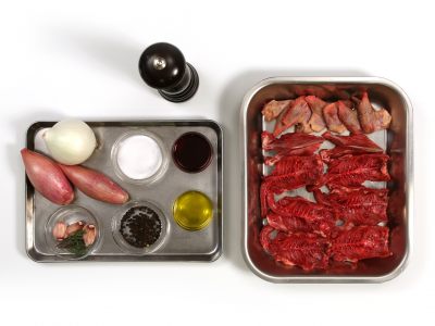 Verser le contenu de la cocotte dans une passoire. Remettre les carcasses dans la cocotte. Mouiller et réduire en plusieurs fois avec le vin rouge.