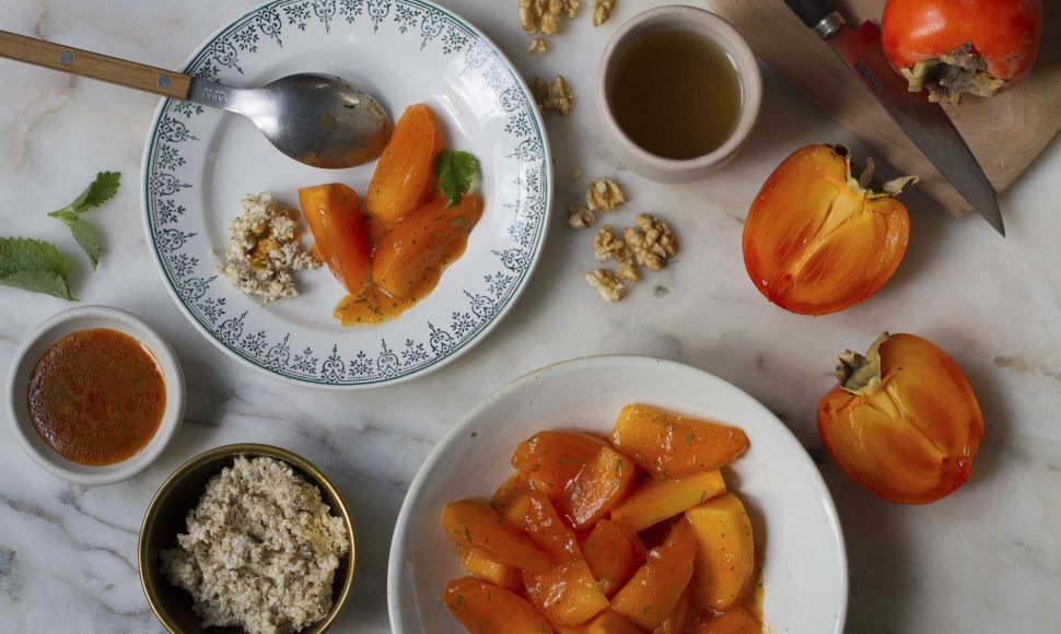 Des kakis relevés au piment et parfumés par une vinaigrette sucrée gingembre-citronnelle, accompagnés d'un condiment aux noix.