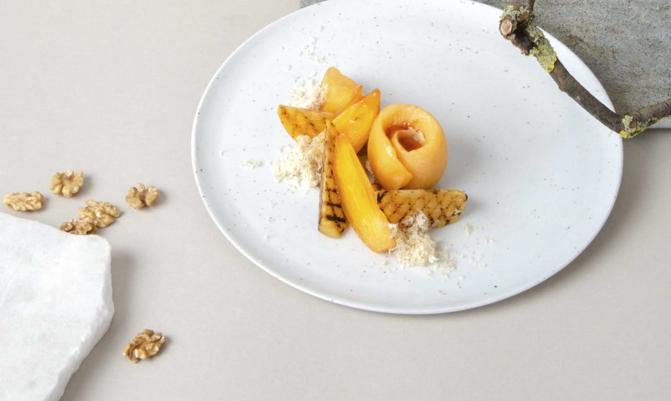 Des kakis frais, mûrs et légèrement grillés, accompagnés d'un condiment noix et d'un sorbet au kaki.