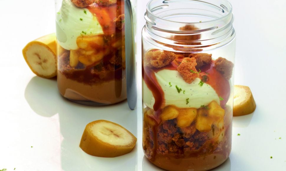 Christophe Michalak revisite le célèbre dessert anglais Banoffee Pie, présenté dans une verrine élégante. Il reprend les saveurs classiques de banane, caramel et crème, tout en y apportant de la légèreté.