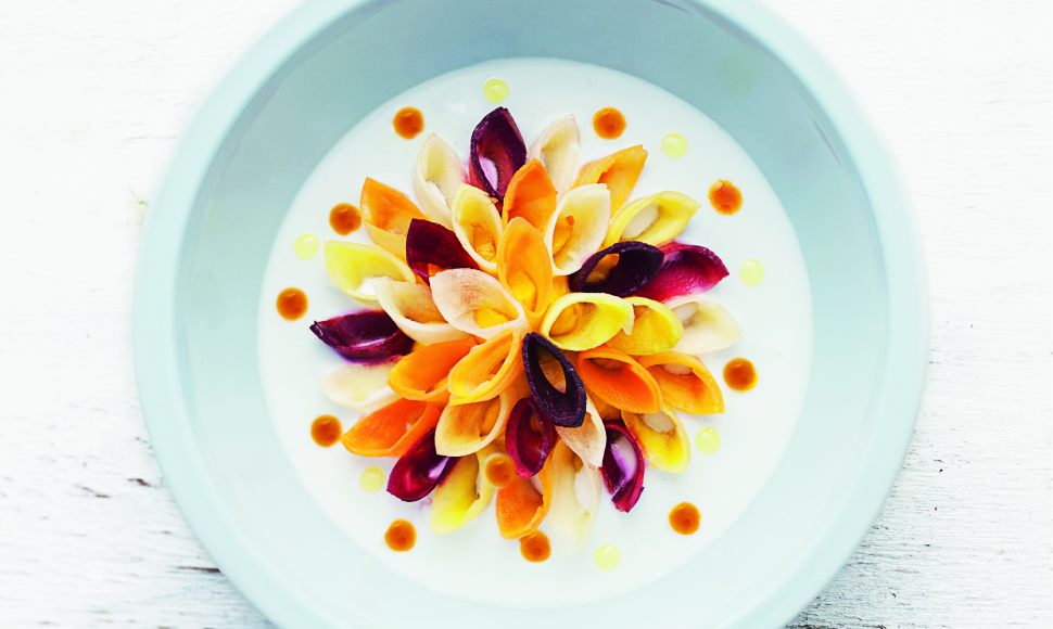 "Tout comme la betterave, la carotte fait naître en moi une curiosité, un intérêt particulier et m’offre un véritable challenge d’accords de saveurs. Si simple, si jolie, que de promesses en termes de présentation aussi ! Le croquant de la carotte crue et légèrement vinaigrée associé au yaourt parfumé à la fleur d’oranger et au poivre de Voatsiperifery apporte une combinaison de saveurs et de textures suave et sophistiquée. Le côté « faussement gras » du yaourt confère à la carotte son velouté, le poivre prolongeant les effets de la fleur d’oranger, flatteuse et rassurante."