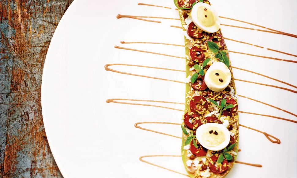Dressez les tranches de courgette marinées au milieu des assiettes. Réservez la vinaigrette de la marinade. Déposez dessus la purée d’anchois, puis parsemez de blanc d’œuf.