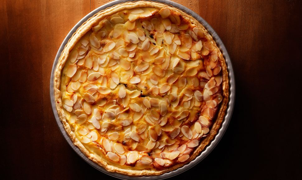 Lorsque la pâte est pré-cuite, baissez la température du four à 160 °C (th. 5). Versez-y le mélange et parsemez d’amandes effilées. Enfournez pour 50 min.
