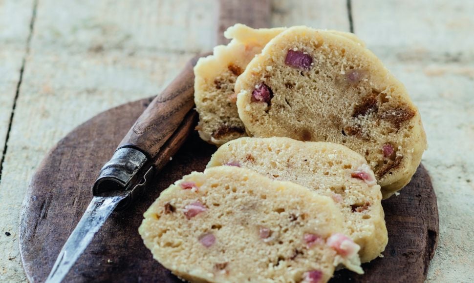 Pendant ce temps, préparez la mique. Faites fondre le lard à la poêle 10 min à feu moyen et coupez le pain en dés. Dans une grande jatte, mélangez le pain, les œufs, le lard et un peu de farine, ajoutez 30 cl de bouillon et continuez à intégrer la farine mélangée à la levure. Salez. Cessez d’ajouter de la farine quand la pâte ne vous colle plus aux doigts. Elle doit quand même rester souple.