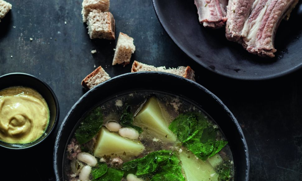 Le jour même, hachez le lard, l’ail pelé et le persil très finement avec un grand couteau. Rincez le petit salé pour retirer l’excèdent de sel. Pelez les pommes de terre, rincez-les et coupez-en deux en tout petits dés. Coupez le reste en morceaux de 3 ou 4 cm de côté. Remplissez une grande marmite avec 6 l d’eau, filtrée si possible. Ajoutez le talon de jambon, les tranches de jarret, les pommes de terre et le hachis de lard. Placez sur le feu et portez à ébullition.