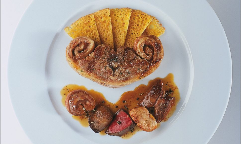 Lamb-chop d’agneau de lait grillé au feu de bois, les abats rissolés, socca