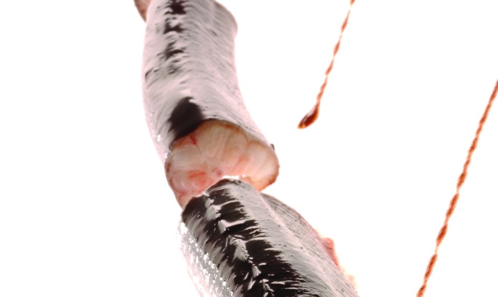 Saigner les lamproies et réserver le sang pour la liaison de la sauce. Enlever la corde dorsale. Inciser délicatement à la base de la tête. À l’aide d’un torchon, tirer la peau de la lamproie vers le bas, sur toute la longueur.