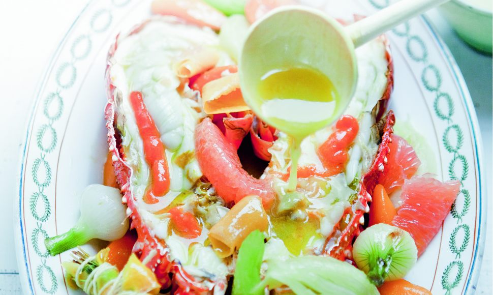 Une belle et heureuse association de la langouste, ce crustacé particulièrement fin, et de légumes de tous les jours, somme toute banals, réunis dans une nage inattendue.Elle est inspirée d’une recette d’Alain Chapel, un des maîtres d’Alain Ducasse, mais elle est très facile à réaliser.