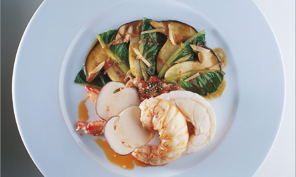 Langouste royale rôtie en carapace sauce – condiment poivre – cèpes