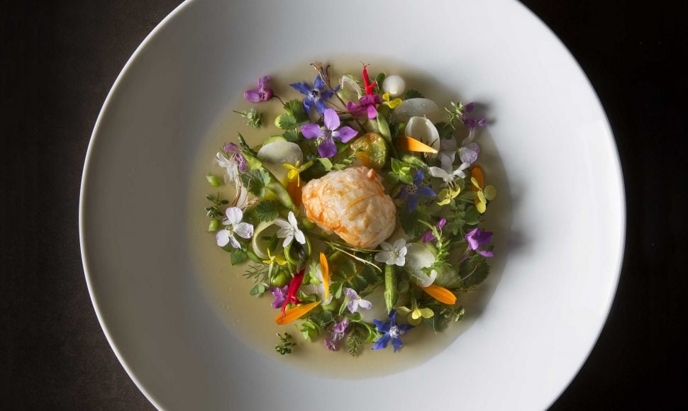 Un plat savoureux et frais, des langoustines accompagnées de pétales d'oignons et d'un carpaccio de navet, d'asperges et de courgette !