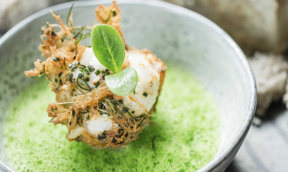 Langoustines en kadaïfi céleri confit en croûte de sel, jus de cresson, caviar avruga