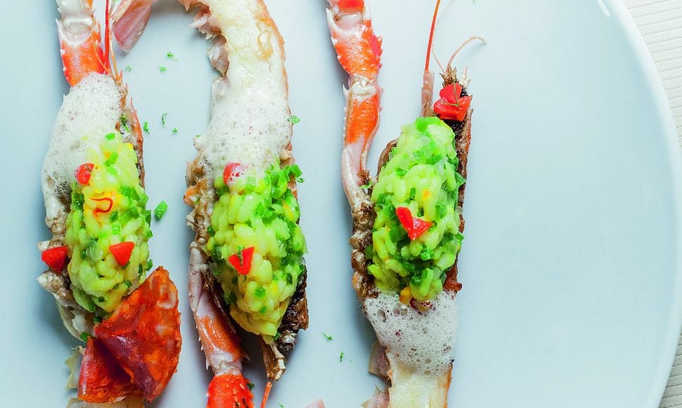 Coupez les langoustines en deux et faites-les mariner dans un plat, la chair vers le bas, avec l’huile d’olive et le piment d’Espelette. Réservez au frais.
