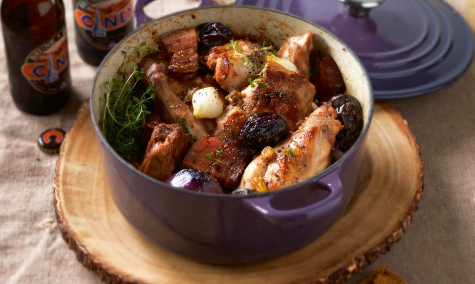 Remettez les morceaux de lapin dans la cocotte, ajoutez les raisins, les pruneaux, le pain d’épices, le thym puis la bière.