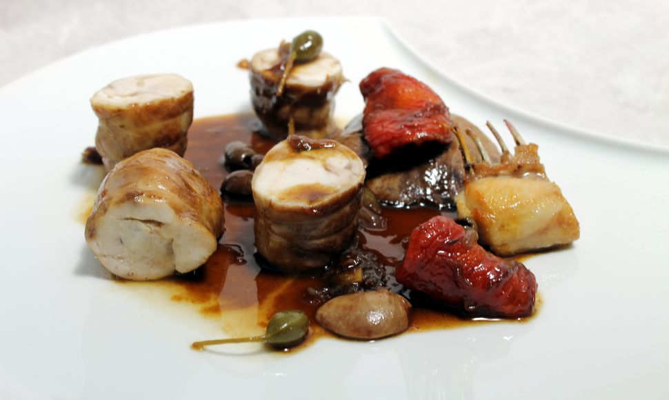 Mettre la crépine à dégorger dans un saladier rempli d’eau froide. Séparer les cuisses du lapin. Les désosser et les couper en 2. Les réserver. Désosser le râble. Récupérer le foie et les rognons. Jeter la tête. Couper le coffre en 4 morceaux. Libérer la noisette du filet. Les parer comme un carré d’agneau. Couper les demi-râbles en 2. Battre légèrement ou inciser la panoufle. Saler et poivrer. Déposer sur chaque râble une feuille de sauge et une olive dénoyautée. Rabattre la panoufle. Essorer et sécher la crépine. Envelopper chaque morceau de lapin de crépine. Les ficeler. Dans chaque cuisse, glisser une pincée de romarin concassé. Rouler chacune dans de la crépine. Déposer râbles et cuisses au frais pendant 20 minutes.
