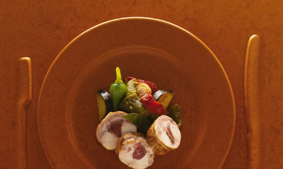 La « samfaina », soeur de la ratatouille provençale, est une sauce/garniture basique de la cuisine catalane. Dans « Conill con samfaina », le lapin enfariné et revenu est ensuite cuit dans la samfaina. Nous avons préféré séparer les cuissons en les allégeant. Et utiliser seulement des râbles que nous avons farcis.