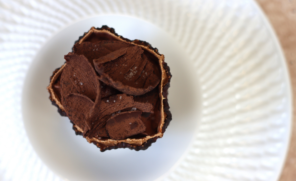 Le chocolat Matsiro, fèves Amelonado glacées, mousse tiède et streusel à la cardamome verte