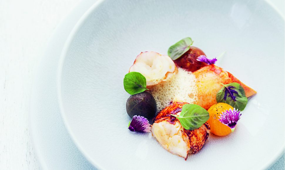 Le homard bleu, tomate en aigre-doux bouillon tomaté et légèrement épicé au café bourbon pointu de la réunion et safran